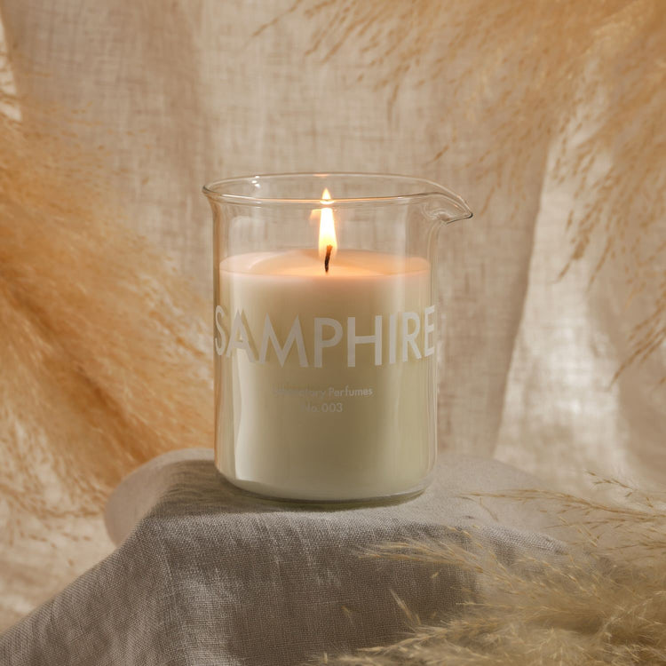 We crushed a sprig of that verbena with a pinch of juniper berries from the spice rack – and Samphire began to take shape. Moving from the kitchen to the lab, we blended in citrus oil, flourishes of lavender, basil and rosemary, and base notes of white amber and oak moss to create a bright, cool, aromatic scent with a lightness of touch that belies its complexity and longevity. The finished scent was so clearly evocative of the seashore we could only call it Samphire.